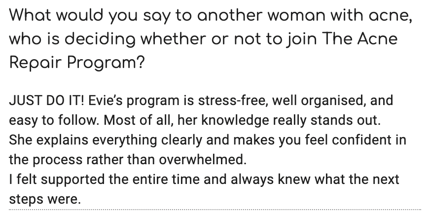 “I have only had one consult so far with Evie but left the appointment feeling great. It was really in-depth which I appreciated and she straight away got the ball rolling to have tests done so that we can start treatment as fast as possible. She was super lovely and made the whole process very easy and comfortable.” - Mia T.
