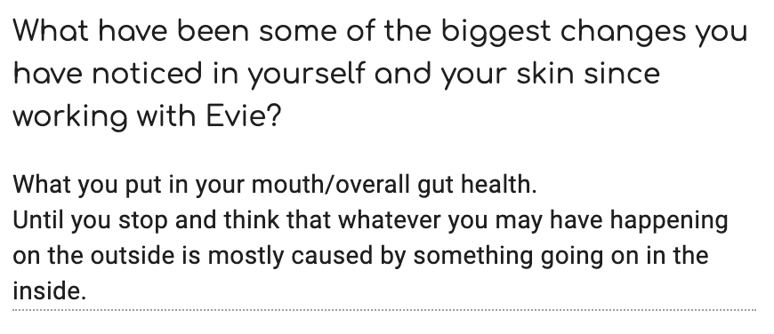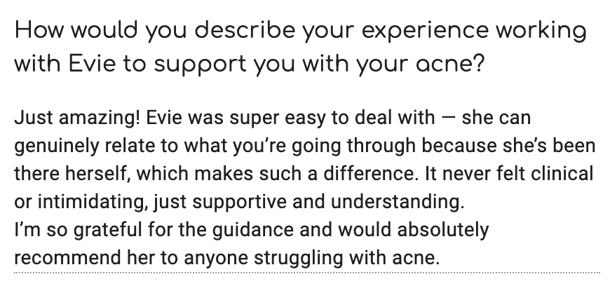 “ My experience with Evie so far has been great, I started seeing Evie as I've been having breakouts on my face and thought she would be able to help me clear my skin! It's only been a couple of weeks since our last appointment but I've noticed such a difference already with how I've been feeling with my gut and seeing my skin clear up. I'm really looking forward to my next appointment with Evie to see the change in my skin after 5 weeks, I would highly recommend her to anyone!